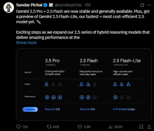 "Gemini 2.5 Pro + 2.5 Flash are now stable and generally available. Plus, get a preview of Gemini 2.5 Flash-Lite, our fastest + most cost-efficient 2.5 model yet," Google CEO Sundar Pichai said in a post on X.